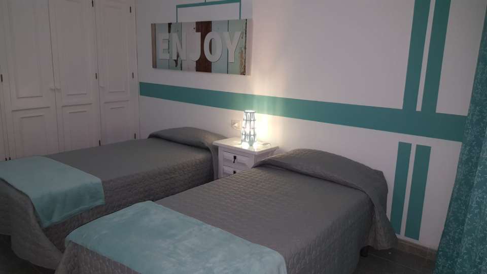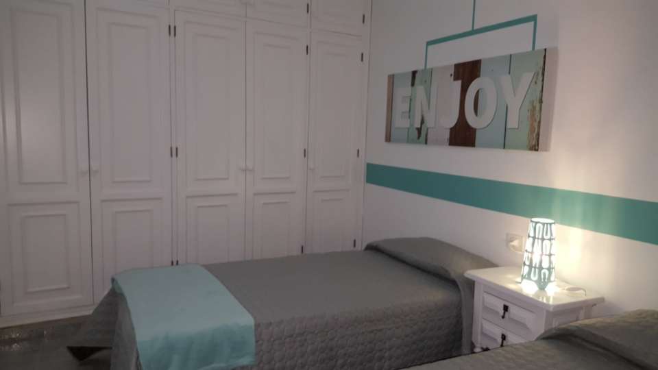 La segunda habitación dispone de 2 camas pequeñas, un gran armario y un ventilador.